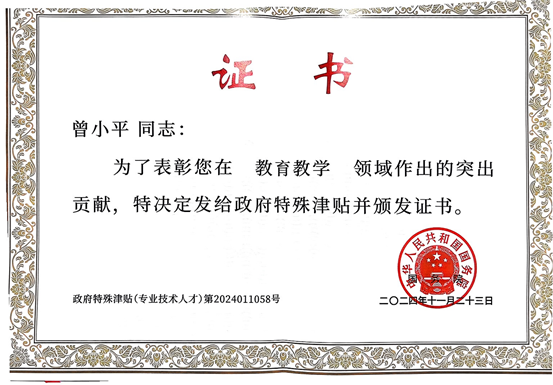 曾小平教授获批享受国务院政府特殊津贴人员,是为教育教学领域作出了突出贡献,也是学校高层次人才队伍建设成果的重要体现。