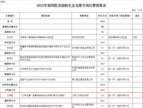 7月18日,河南省科技厅下达《2025年第四批省创新生态支撑专项经费预算的通知》,兰考三农职业学院现代农业学院吕伟增博士主持的河南省县(市)创新引导计划项目《“兰考红薯”脱毒种苗标准化快速扩繁与应用推广》获批,项目经费55万元。