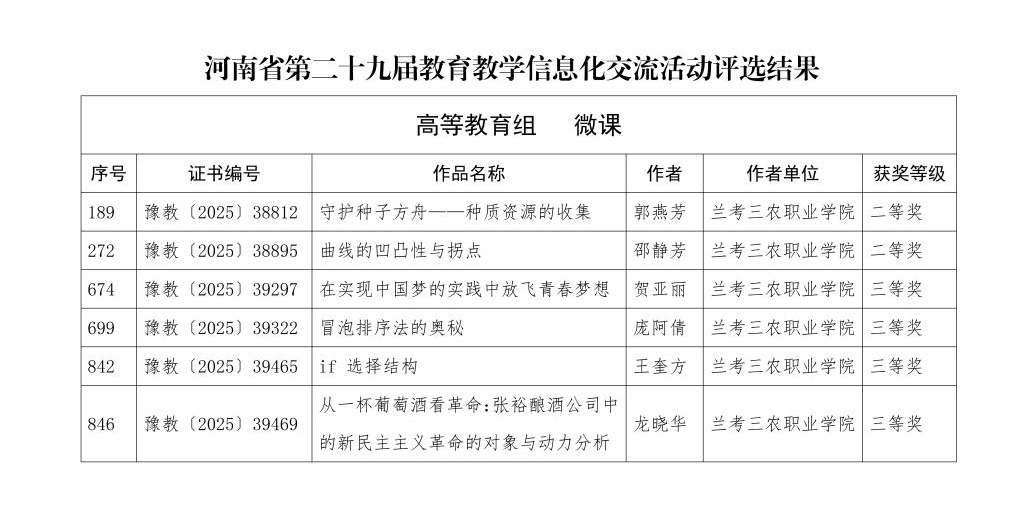 在河南省第二十九届教育教学信息化交流活动中,我校共有6件作品获得佳绩,荣获高等教育组微课二等奖2项、三等奖4项。