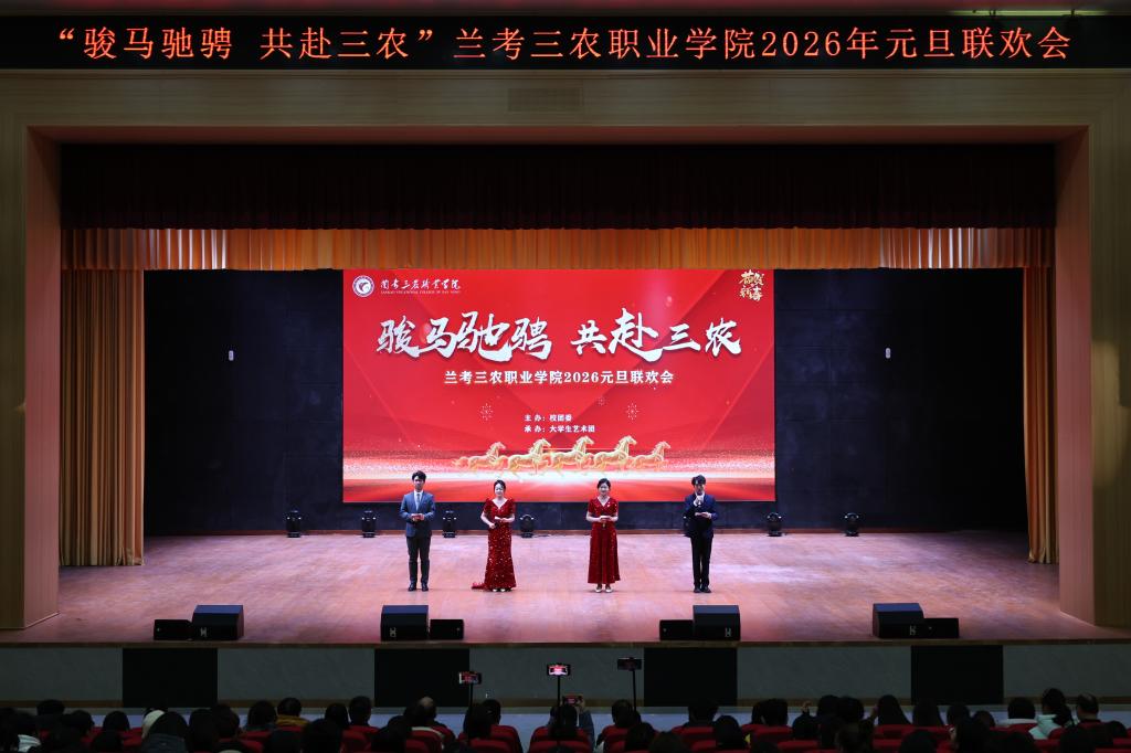 12月26日,兰考三农职业学院举行“骏马驰骋 共赴三农”2026年元旦联欢会。校党委书记曾小平、党委副书记王凤普、副校长孔德省、纪委书记张志强、副校长白宝山出席。