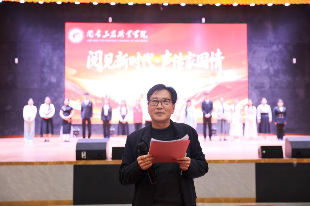 比赛结束后,副校长白宝山对本次大赛进行现场点评。他充分肯定了各位选手的精彩表现与扎实功底,从诵读技巧、情感表达、作品理解等方面进行细致点评,并寄语同学们多读经典、善用声音,在诵读中坚定理想信念,在传承中彰显青春担当。