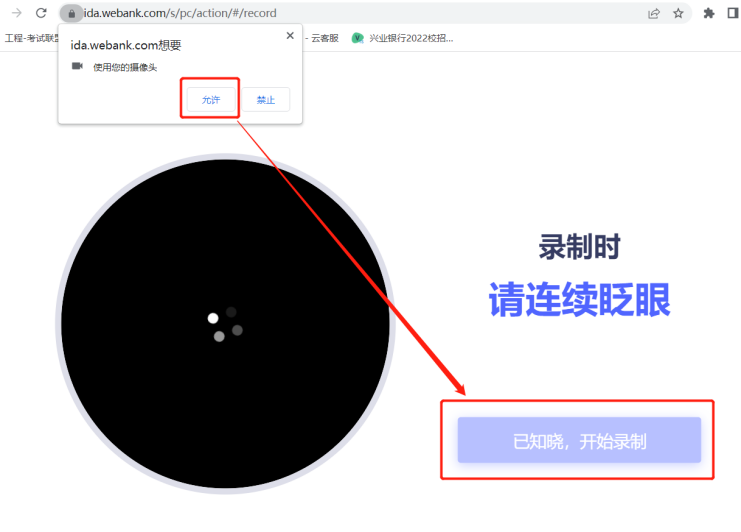 人脸识别前如有弹出“想要使用您的摄像头”,请点击允许。点击开始录制。