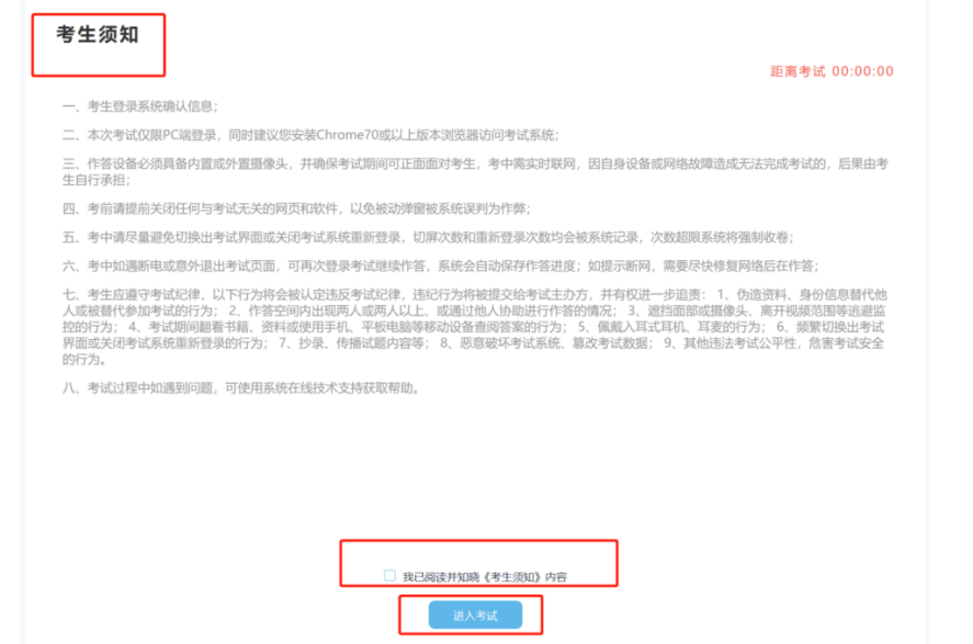 考生认真阅读考生须知内容,确认“已阅读并了解考生须知”,开考时间到会直接进入考试答题界面。