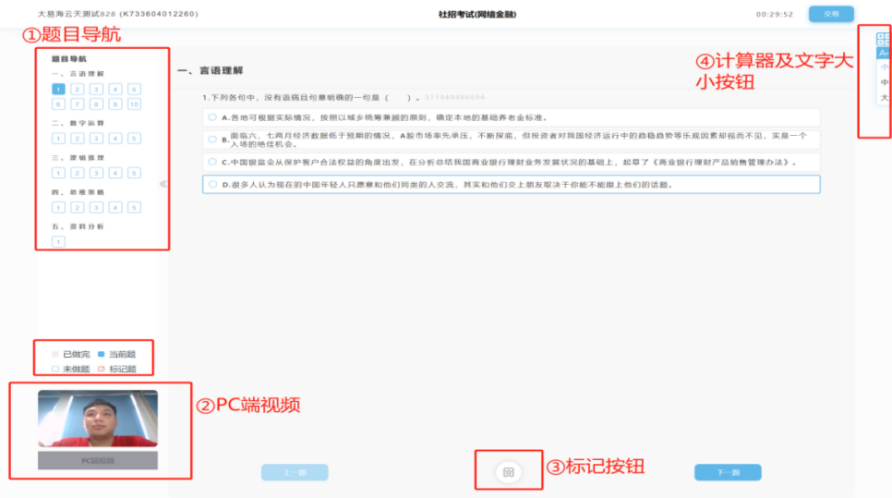 考试答题界面,普通试卷左下角会实时显示视频录制画面,左下角显示PC端和移动端的监控录制画面,可以切换显示两端画面,默认是PC端。