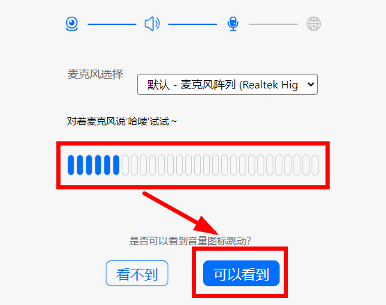 对麦克风说话,看到音量图标跳动,点击可以看到。