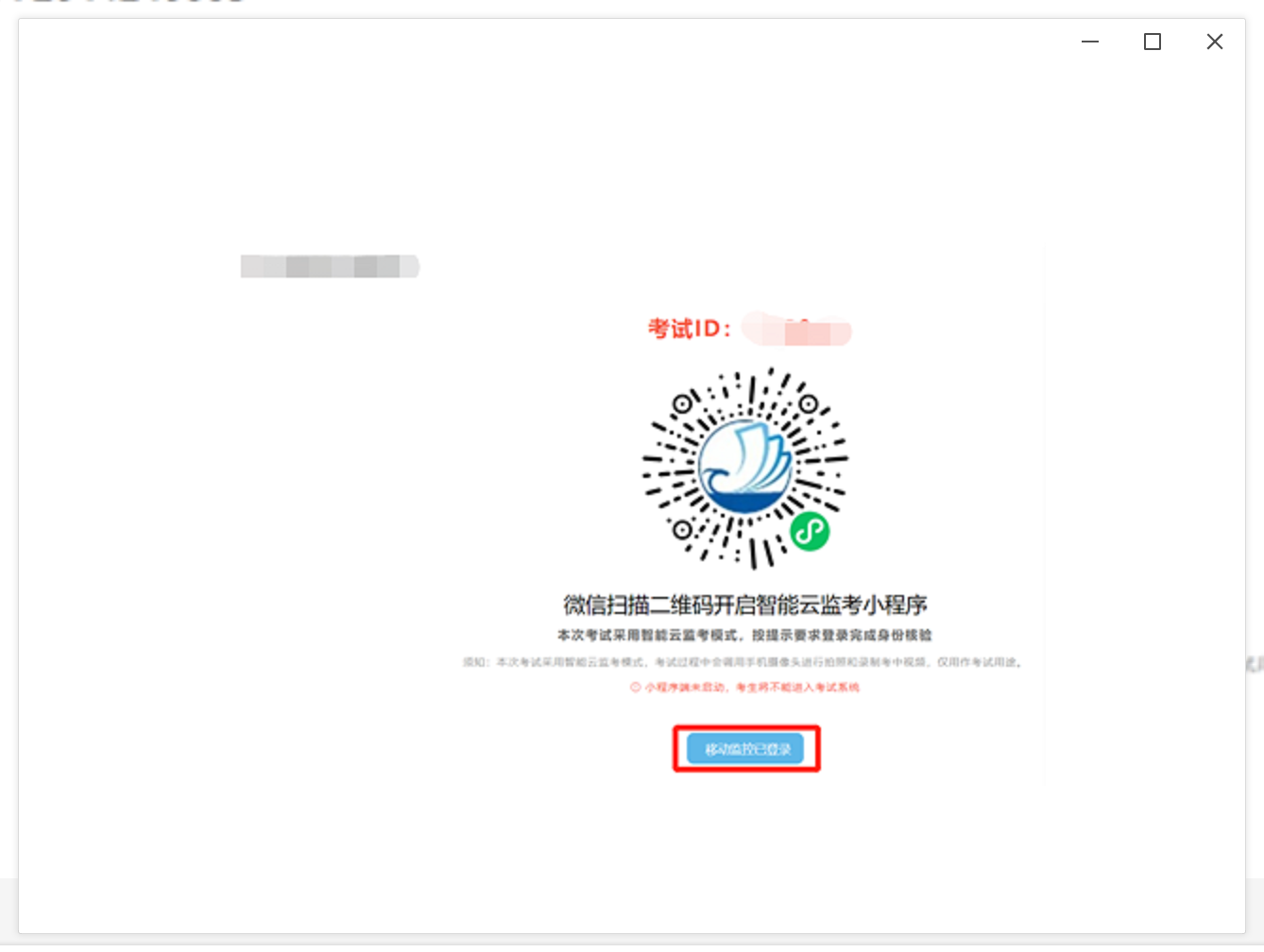 手机监控打开后,电脑端的状态变成移动监控已登陆,点击“移动监控已登陆”,出现考生须知内容,