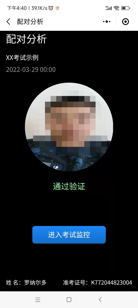 扫描二维码后跳转至输入身份证号码和本场考试ID,核对自己的信息后,点击“拍照验证”,手机端监控如提醒验证失败,可以点返回重拍,如多次提醒验证失败,点“进入考试监控”即可,后台会有管理员审核。显示通过验证后,点击“进入考试监控”。