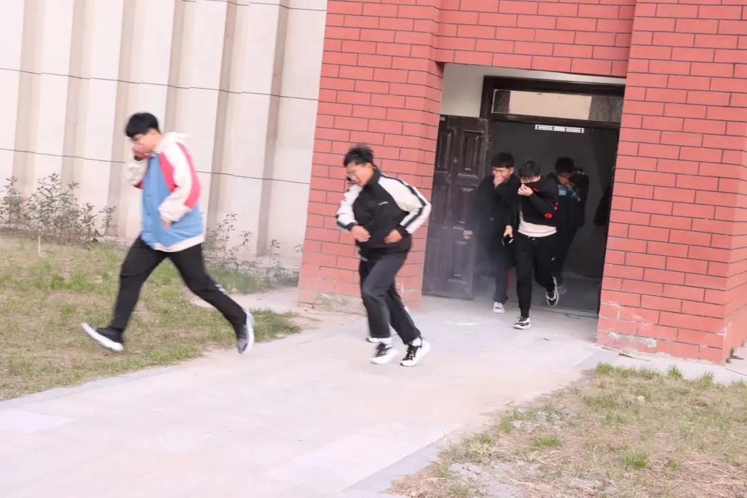 在模拟火灾现场,保卫科工作人员在模拟起火部位点燃烟雾弹,随着警报声响起,参加演练的学生在疏导员的指挥下做好防护、冒着浓烟,按照指定路线快速、有序、安全地疏散到集结地。