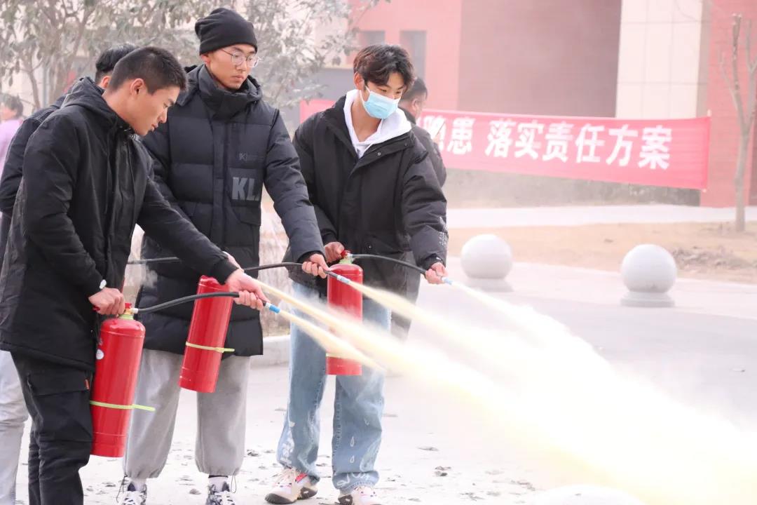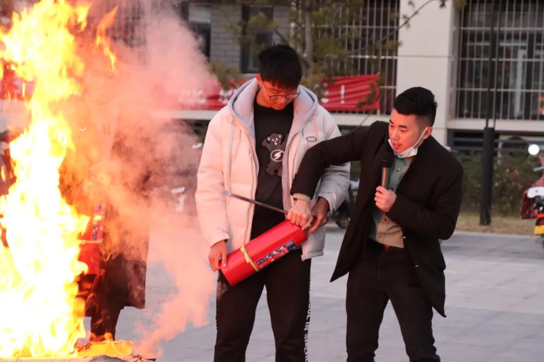 王教官为师生员工讲解火灾现场逃生的技巧,并介绍灭火器的正确使用方法:“一提”“二拔”“三按压”。在黄教官的指导下,师生员工分批上前体验如何使用灭火器灭火,达到了真学、真会、真用的演练效果。