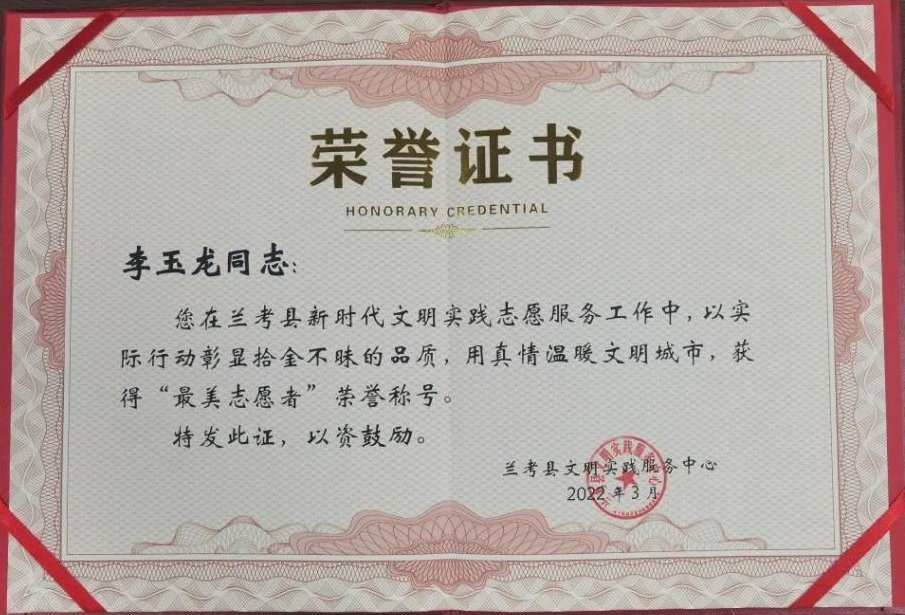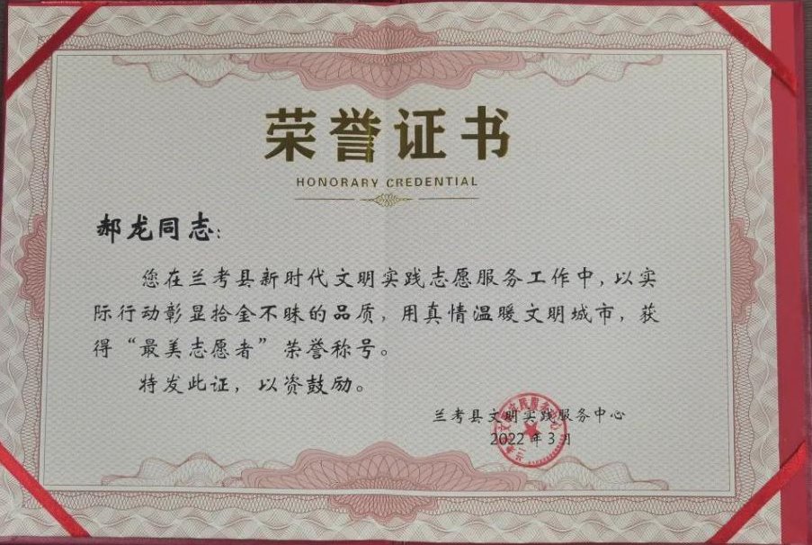 3月10日上午,兰考县文明实践服务中心工作人员来到我院,中心副主任李苗苗代表县文明实践服务中心为我院教师郝龙、李玉龙颁发“最美志愿者”荣誉证书,表彰二位老师在兰考县新时代文明实践志愿者服务工作中拾金不昧的高尚行为,他们用实际行动彰显了志愿者责任与担当,用真情温暖了文明城市。
