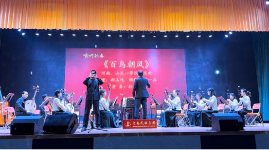 河南民族乐团表演老师们以民族管弦乐《山村节日》作为开场,欢快的节奏与美妙的旋律瞬间吸引在场观众,笛子独奏曲《扬鞭催马运粮忙》、民族管弦乐《豫调》、二胡齐奏《新赛马》、琵琶齐奏《十面埋伏》等赢得场上阵阵掌声,《百鸟朝凤》用民族乐器唢呐模仿各种鸟鸣声,与伴奏的笛子一唱一答,乐曲欢快热情、诙谐风趣,把整场音乐会气氛推向高潮......