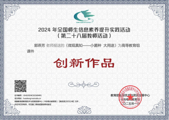 近日,2024年全国师生信息素养提升实践活动(第二十八届教师活动)结果公示,我校郭燕芳老师报送的《微观真知——小菌种 大用途》作品,荣获高等教育组课件组“创新作品”奖。