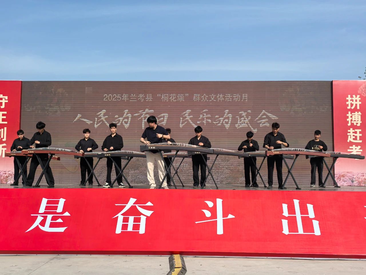 在启动仪式上,来自中央音乐学院的文艺宣讲师卢书新带领兰考三农职业学院的九位男生为观众上演古筝齐奏《男儿当自强》。演出形式新颖,曲目铿锵有力,受到县委领导及台下两千余名观众的一致好评。