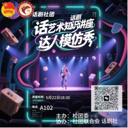 活动简介:话剧社模仿秀& 知识讲座:戏精的狂欢,知识的盛宴来袭!各位戏精预备役、舞台梦想家、话剧狂热粉注意啦!话剧社即将开启一场 “脑洞与演技齐飞,干货共笑点一色” 的超级派对 ——「模仿秀狂欢夜」和「话剧知识魔法课堂」重磅来袭!不管你是想在舞台上放飞自我,还是想深挖话剧背后的神秘宝藏,这里都能让你嗨到过瘾,学到上头!