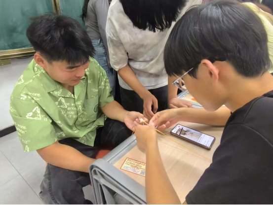 为了增进大家的专注力和同学们之间的情感,开展了手绳DIY活动。活动现场,五彩丝线穿梭于指尖,同学们沉浸其中,编织的不仅是精巧手绳,更是一份专注与心意。从初学时的手忙脚乱,到熟练掌握平结、金刚结、蛇结等,每一根丝线的交叠都饱含着对传统手工艺的敬重与传承。