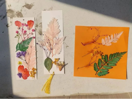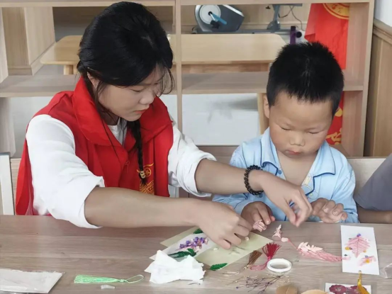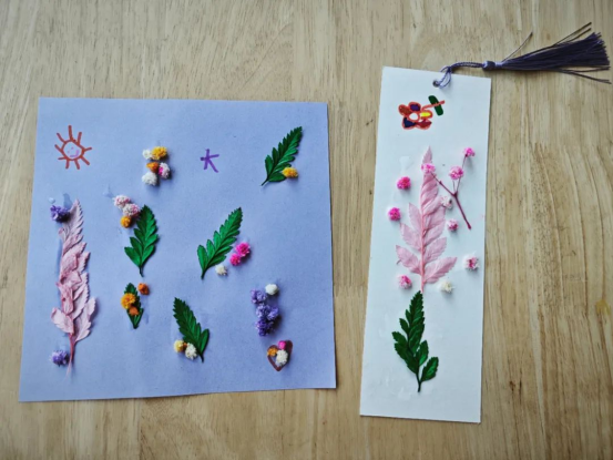 在热闹非凡的活动现场,志愿者们手把手地教导孩子们将干花巧妙地粘贴成一幅幅精美的书签与贴画,形成一幅幅生动的自然画卷。