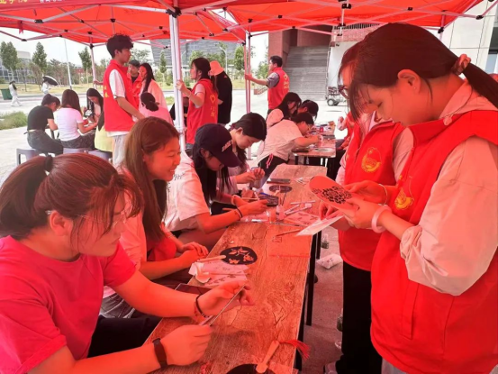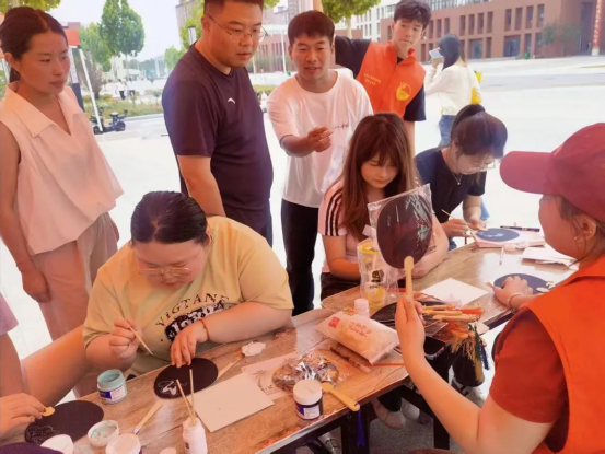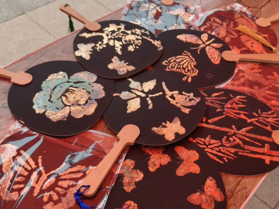 活动现场,志愿者们不仅积极的宣传铜箔扇这项非遗,还热情耐心的指导大家如何制作铜箔扇,协助他们制作出更精美的铜箔扇。
