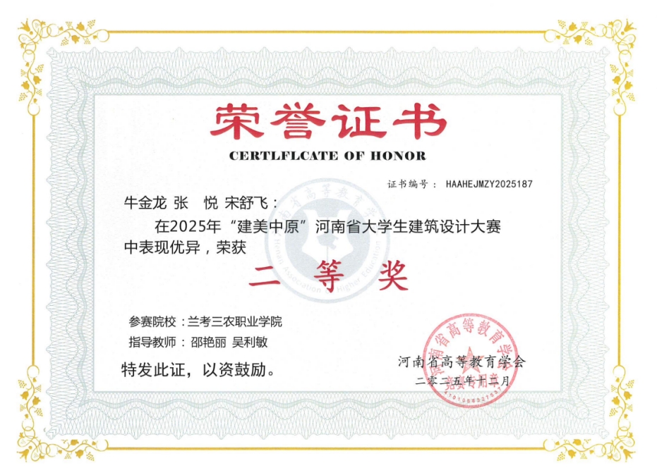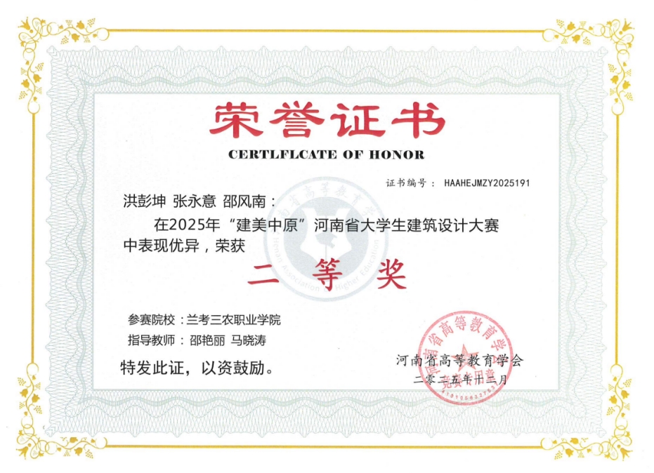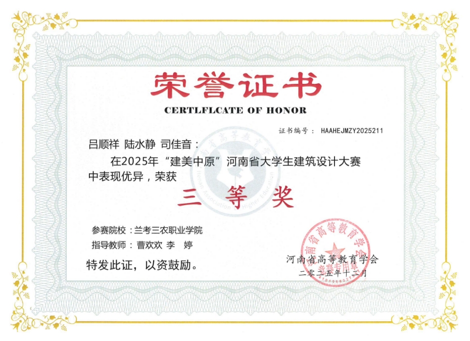 12月26日,2025 年“建美中原”河南省大学生建筑设计大赛获奖结果正式公布,兰考三农职业学院建筑设计与技术学院学子凭借扎实的专业功底、创新的设计理念及团队协作精神脱颖而出,一举斩获多项荣誉,彰显了学院育人成效。