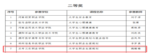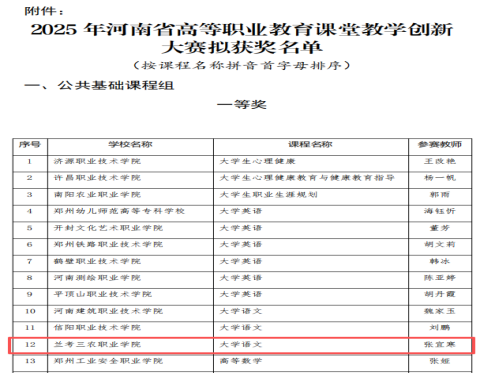 近日,河南省教育厅公布了2025年河南省高等职业教育课堂教学创新大赛拟获奖名单,我校教师凭借卓越的教学能力,在本次比赛中荣获一等奖1个、二等奖5个。