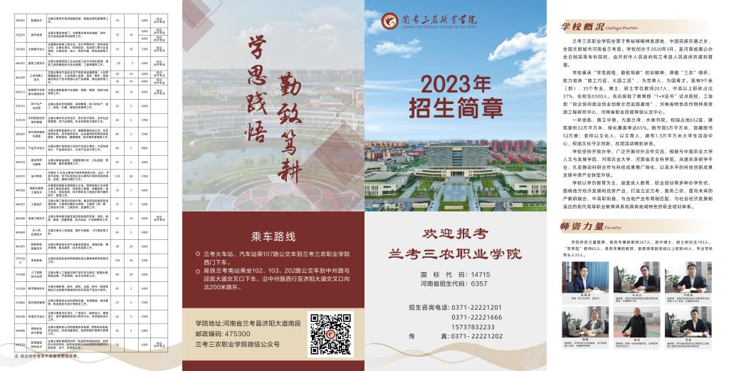 兰考三农职业学院坐落于焦裕禄精神发源地、中国民族乐器之乡、全国文明城市河南省兰考县。学校创建于2017年,2020年成功获批,是一所公办全日制高职专科院校。校园占地652亩,建筑面积32万平方米,总投资13.6亿元,教学科研和实验仪器设备总值1.2亿元,馆藏图书总量32万册,标准化学生公寓四人一间。学校现设有9个系部,35个专科招生专业,在校学生4300人。现有专兼职教师245名,其中博士、硕士研究生189名,“双师型”教师62名,专兼职副高以上职称36名,学科带头人35名。
