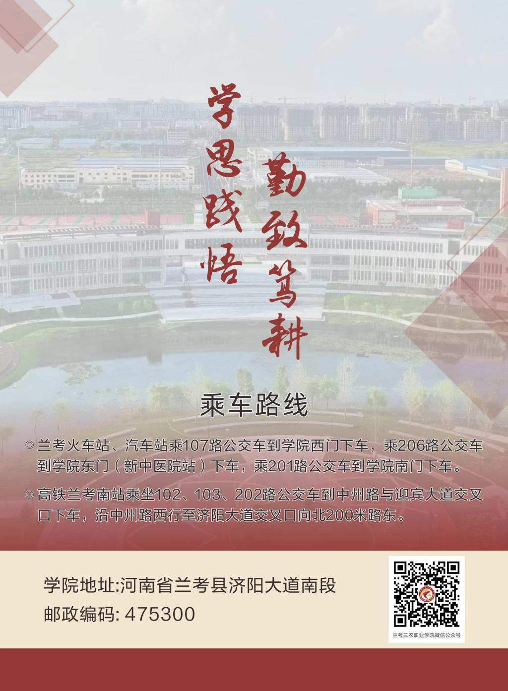 乘车路线:1、从兰考火车站或汽车站乘201公交车到兰考三农职业学院南门下车即到。
