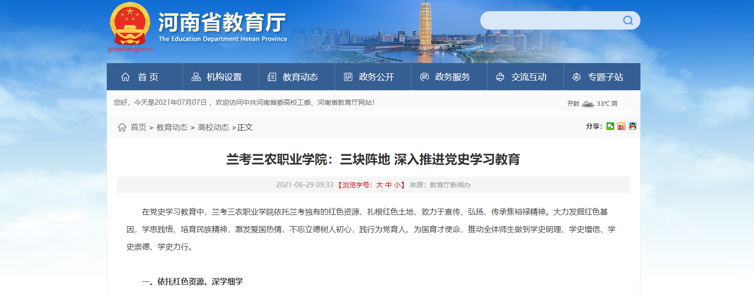 6月29日,在河南省教育厅官网上,悄然出现了兰考三农职业学院的名字。河南省教育厅官网截图兰考三农职业学院自党史学习教育开展以来,严格按照上级要求,在全体师生中深入开展党史学习教育,取得了良好的效果。此次省教育厅网站刊发我院的经验做法,也是对...